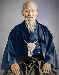 (14 diciembre 1883 - 26 abril 1969) También conocido como O´Sensei (Gran Maestro) o Kaiso (Fundador). Nació en TANABE provincia de Kii (actualmente prefectura de Wakayama). Fue el creador de Aikido, el “Arte de la Paz”, luego de haber dedicado toda una vida a la práctica de las Artes Marciales. Algunas de estas fueron: TENJIN SHIN'YO-RYU JUJUTSU bajo la enseñanza de Tokusaburo TOZAWA (Tokio - 1901); GOTO-HA YAGYU SHINGAN-RYU bajo Masakatsu NAKAI (ciudad de Sakai - 1903 a 1908); Judo bajo Kiyoichi TAKAGI (Tanabe – 1911); DAITO-RYU JUJUTSU bajo Sokaku TAKEDA (Hokkaido – 1915); Ueshiba estuvo influenciado espiritualmente por la religión OMOTO - KYO, especialmente por los pensamientos del reverendo Onisaburo DEGUCHI. En el año 1924 lo acompaña a Manchuria y Mongolia con el objetivo de fundar una colonia utópica. Es tomado como prisionero por militares en su paso por China y finalmente liberado gracias a las influencias del gobierno japonés. En 1931 establece el Dojo Kobukan, centro de sus actividades, en donde durante 11 años se dedica a la enseñanza de Daito-ryu Aikijujutsu. Gradualmente comienza a separarse de Sokaku Takeda y comienza a llamar a su Arte Aiki Budo. Al final de la Segunda Guerra Mundial Ueshiba deja de enseñar en Tokio y se retira a la Región de IWAMA prefectura de IBARAKI. Allí se dedica a una vida mas austera de intenso entrenamiento, meditación y al trabajo del campo. Es en el año 1942 que el nombre de AIKIDO se torna oficial y es reconocido por el Ministerio de Educación de Japón. Ueshiba recibió en 1960 la condecoración Shiju Hosho (Medalla de Honor de la Cinta Púrpura) del gobierno de Japón. Sus últimos años los pasó en Tokyo principalmente en donde su salud fue decayendo gradualmente. A pesar de esto continuó dictando clases hasta que en Febrero de 1969 enferma y es internado en el Hospital de Keio. Es dado de alta y se retira a su hogar donde el 26 de Abril fallece de cáncer de hígado. Ueshiba dictó clases a cientos de estudiantes durante más de 50 años de enseñanza. Se caracterizó por una visión ética, humanista y compasiva de las Artes Marciales. Nutrió al Aikido con una profunda filosofía la cual hace prevalecer por sobre todo, el concepto de la no violencia en vez de la victoria por sobre el adversario.